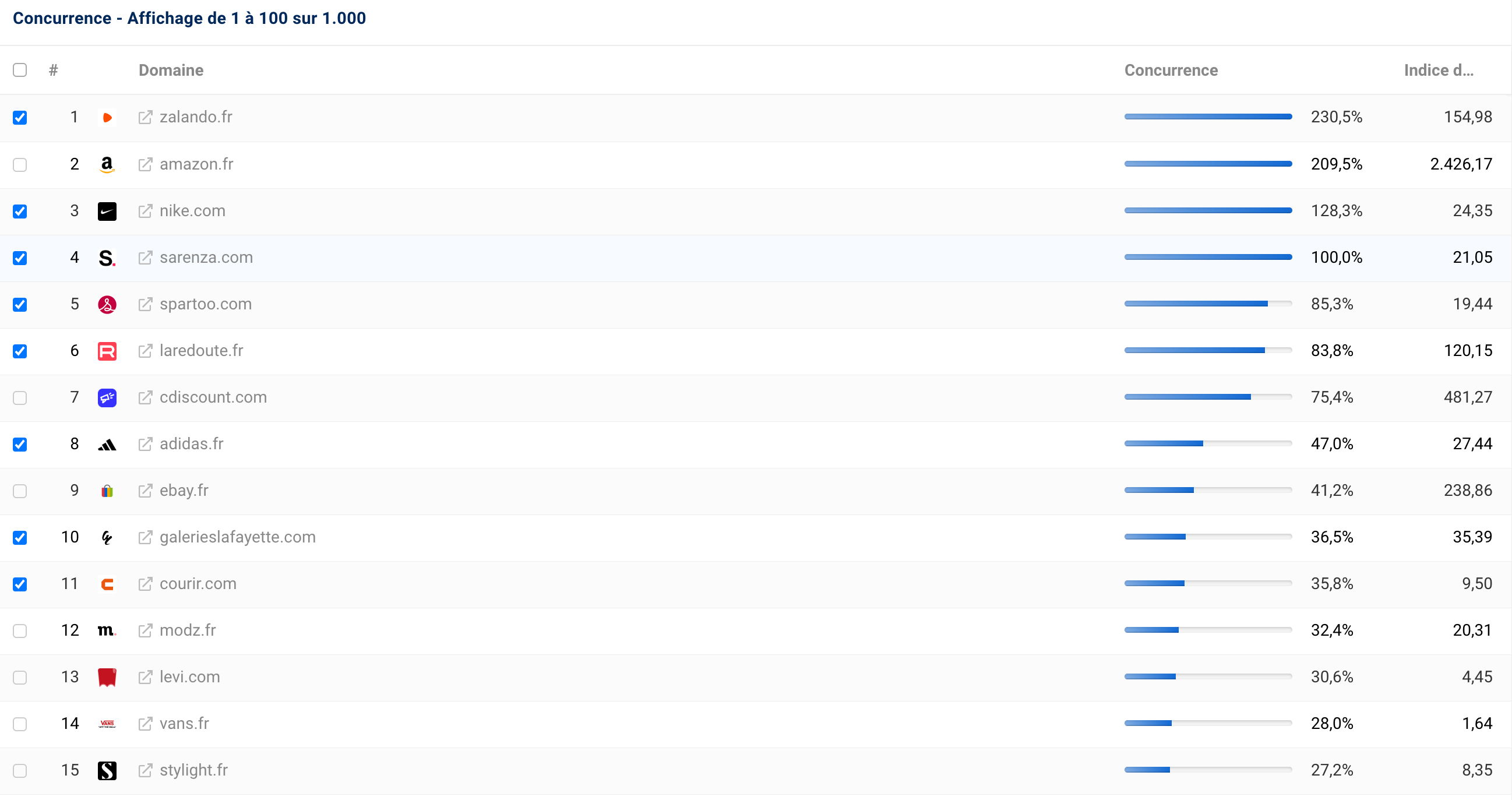 Dans l’aperçu des « Concurrents », accessible via le menu de navigation à gauche, les concurrents jugés pertinents sont sélectionnés par défaut à l’aide de cases à cocher.