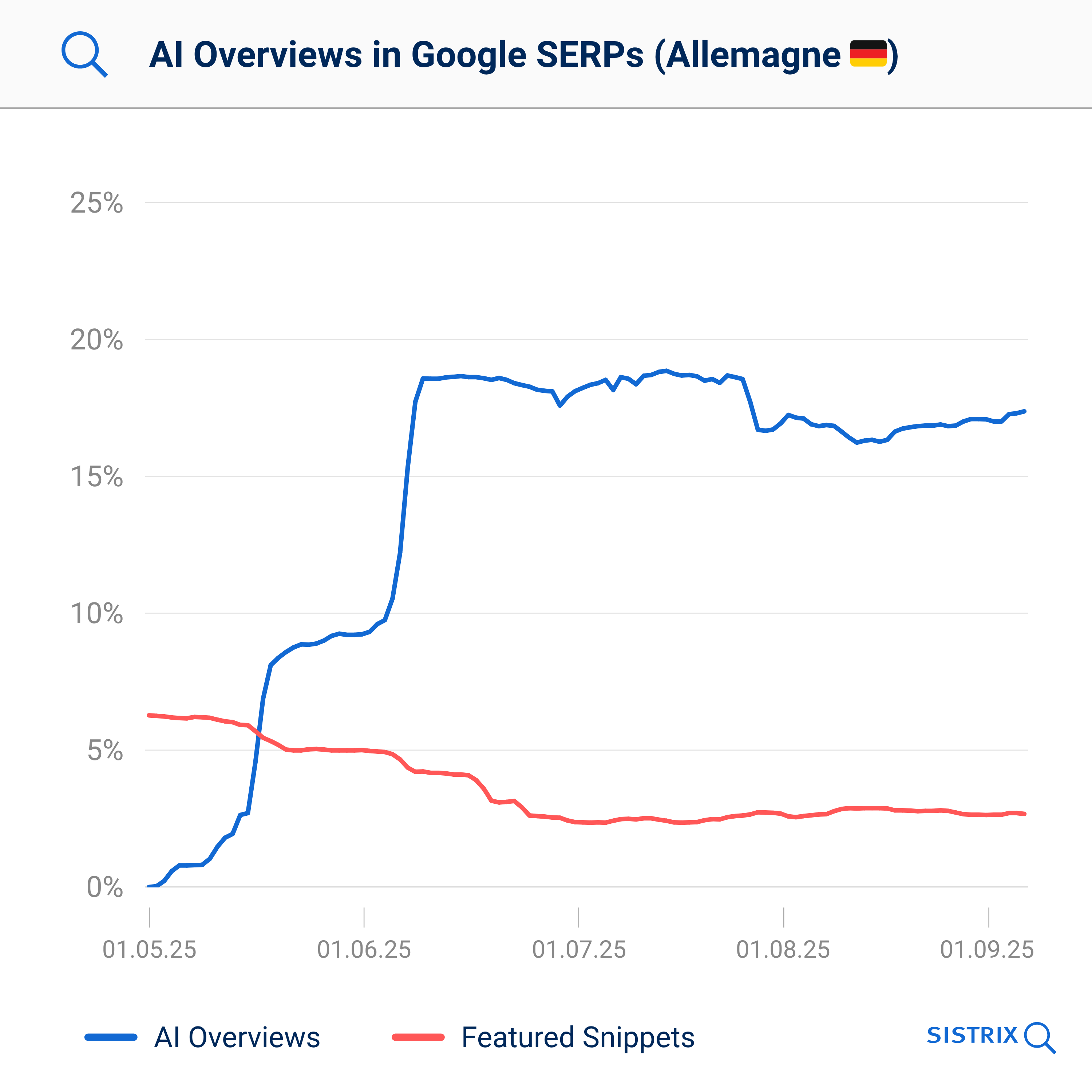 Actuellement, le déploiement des AI Overviews en France n’est pas généralisé comme en Allemagne. Cependant, nous pouvons nous baser sur les chiffres de nos voisins allemands pour anticiper ce qui nous attend. Là-bas, depuis mai 2025, les AI Overviews sont largement présentes et leur nombre a augmenté très rapidement pour ensuite se stabiliser. Actuellement, elles sont visibles pour environ 17 % de toutes les requêtes de recherche.