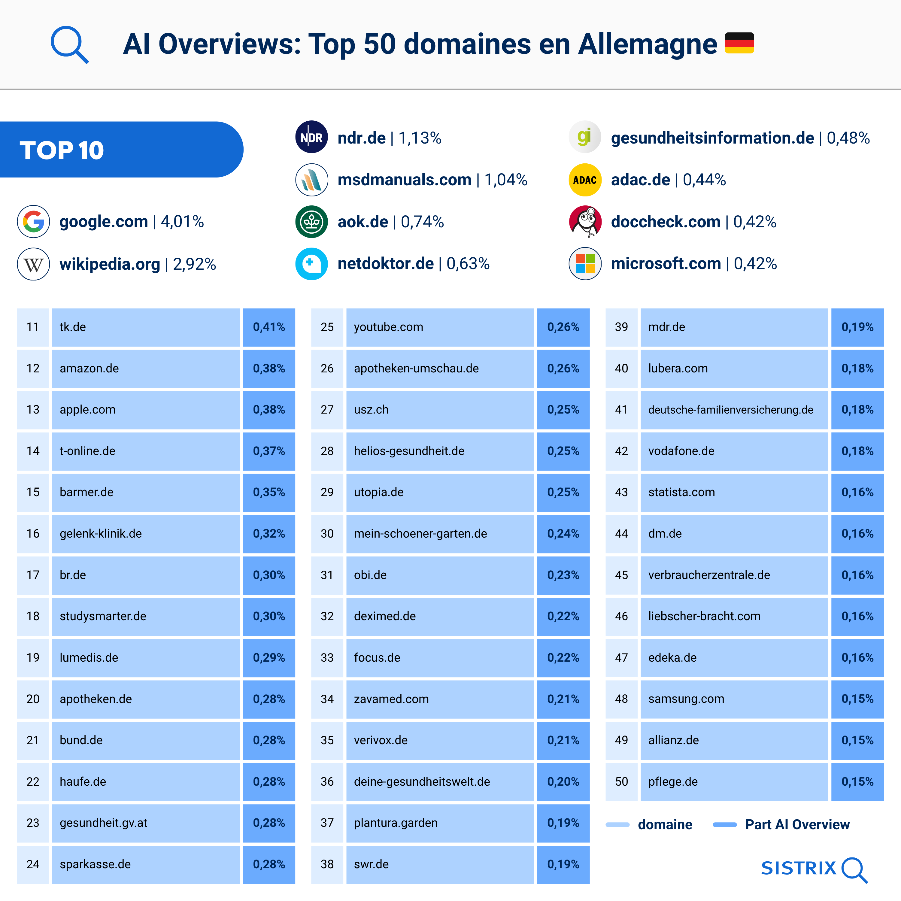 En Allemagne, plus de 360 000 domaines sont actuellement cités comme sources dans les AI Overviews. Le top 50 est largement dominé par des portails de santé comme AOK, Netdoktor ou MSD Manuals. Les médias de service public, comme le NDR, y sont également très bien représentés.