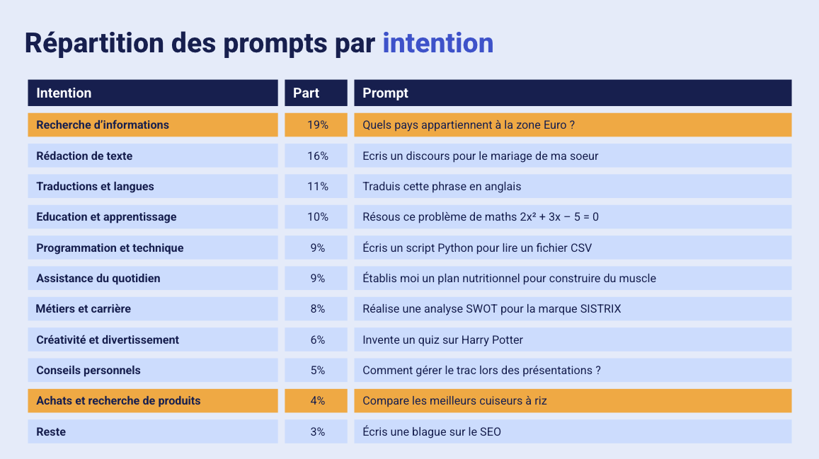 Pour établir une comparaison équitable, nous devons isoler la part de l’utilisation de ChatGPT qui a une réelle intention de recherche (Search Intent). J’ai utilisé trois sources de données différentes pour cela :