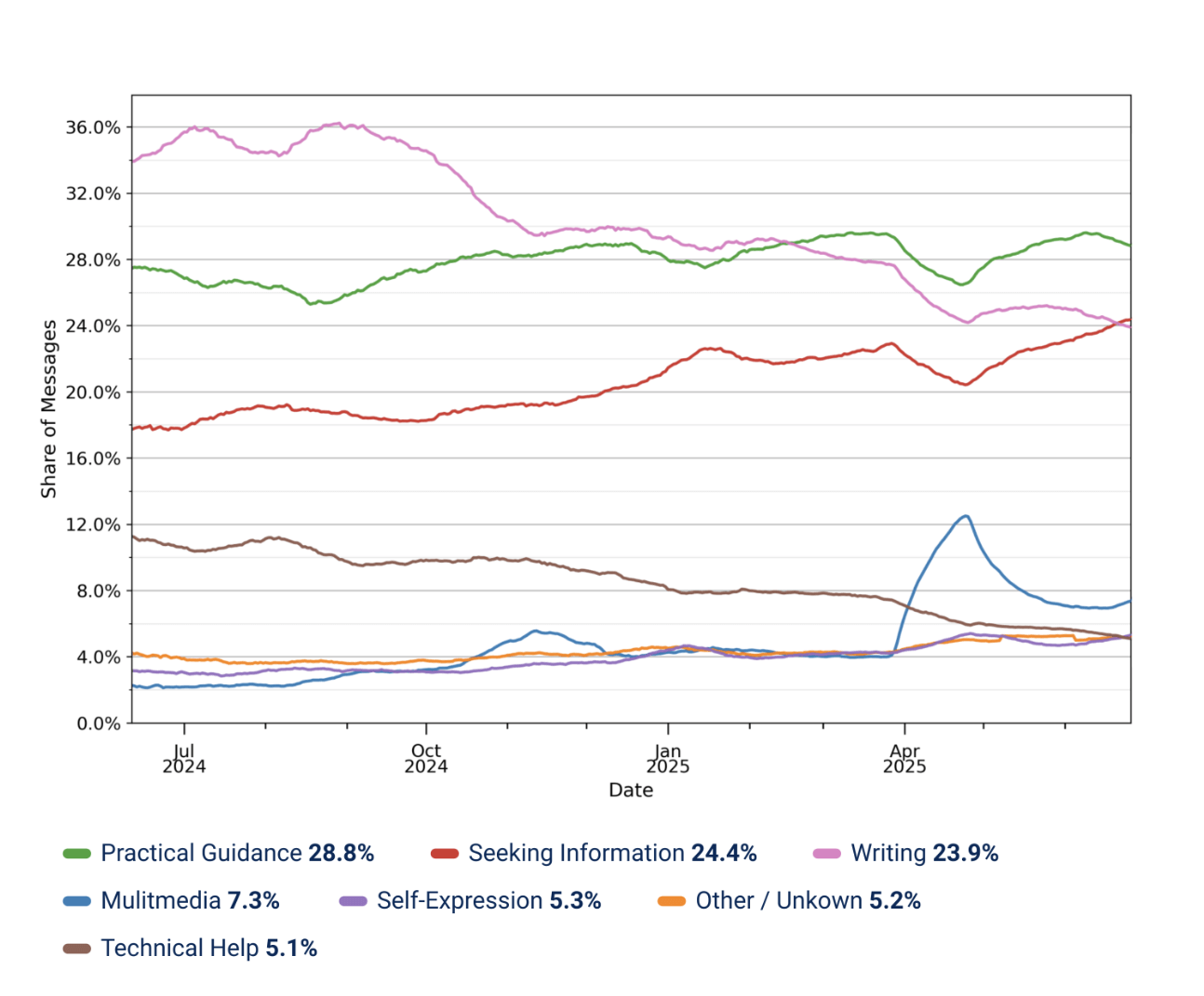 3. Données officielles d’OpenAI Il est intéressant de noter que nos mesures correspondent presque exactement aux données internes qu’OpenAI a récemment publiées dans un article. La catégorie « Seeking Information » (Recherche d’informations) y est indiquée à 24,4 % de l’utilisation totale. La plus grande catégorie d’utilisation selon OpenAI est d’ailleurs « Practical Guidance » (Conseils pratiques) à 28,8 %.