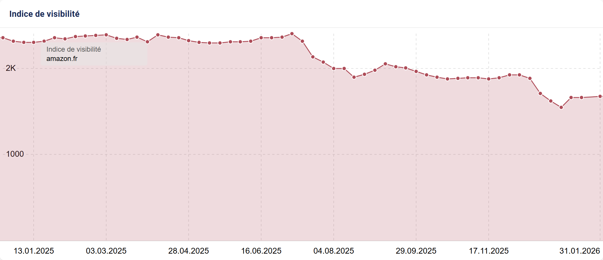 Amazon figure parmi les domaines ayant enregistré la plus forte perte de visibilité en valeur absolue en 2025, notamment à la suite du Core Update de juin 2025.