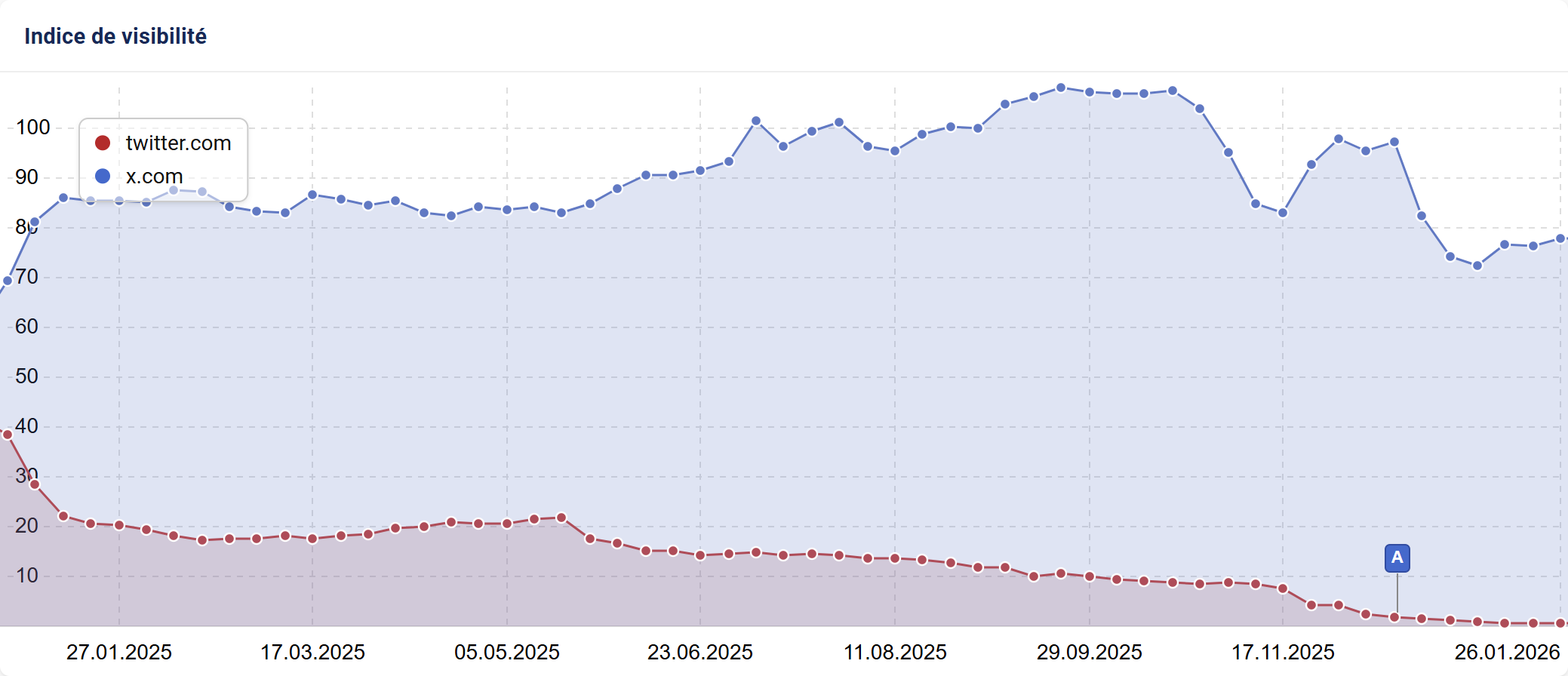 La rupture est nette. Après plusieurs années de stabilité relative, la visibilité chute rapidement et durablement à partir de l’été 2025.