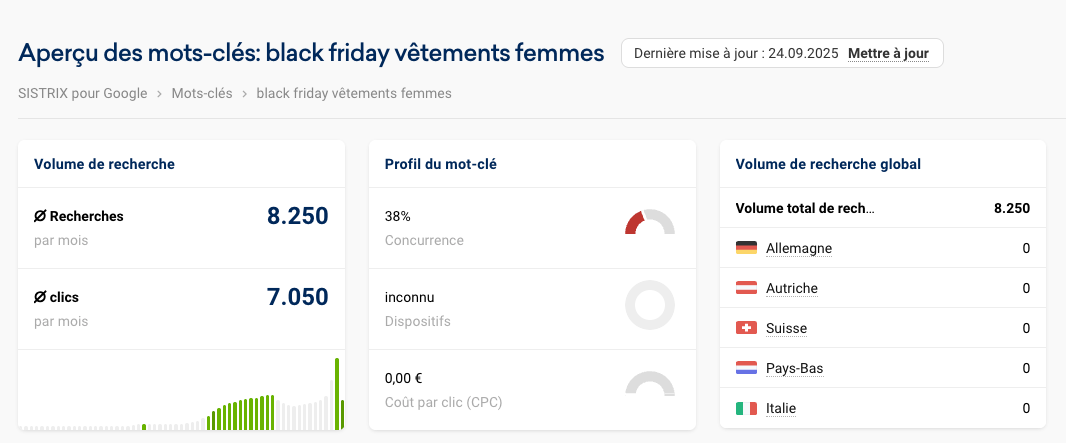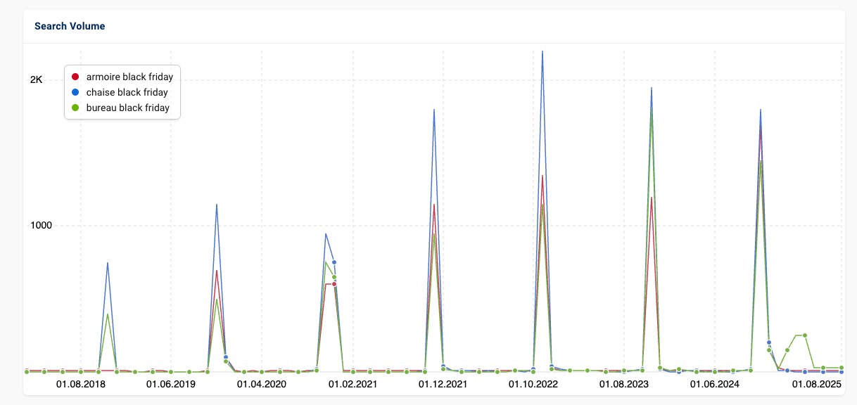 Attention cependant à la lecture de ces données. Ces requêtes rentrent dans la définition du QDF (query deserves freshness) et les résultats de recherche lors de l’écriture de cet article et lors du Black Friday seront bien différents.