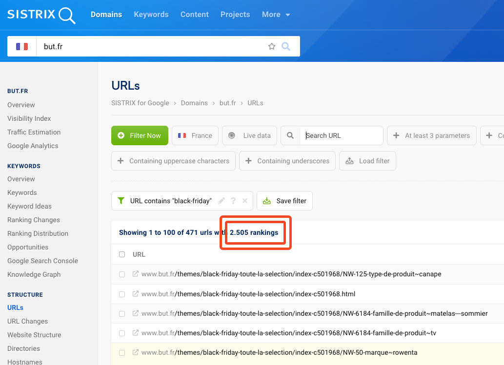1. Identifier les mots clés principaux de votre niche en utilisant toutes les sources à votre disposition: SISTRIX évidemment, mais aussi Google Search Console et vos données internes