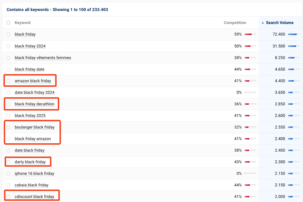 Attention aux volumes de recherche : s’agissant de moyennes mensuelles annuelles, les volumes réels en Novembre peuvent être assez impressionnants. Par le passé, j’ai vu des sites E-commerce dont le trafic sur la marque était en deçà du trafic sur des termes liés au Black Friday durant cette période, n’hésitez donc pas à regarder les volumes dans votre niche.