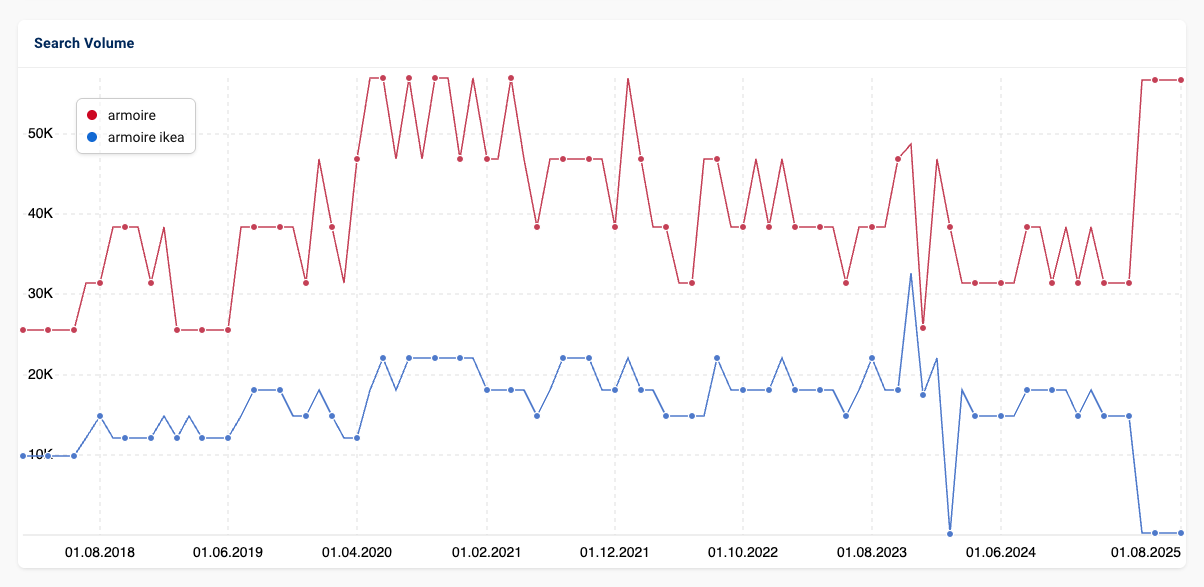 Cette niche est atypique car la marque d’IKEA est si forte que les volumes des requêtes de marque sont parfois assez proches de leurs équivalents génériques. Une situation qui est similaire pour LeBonCoin dans un autre secteur.