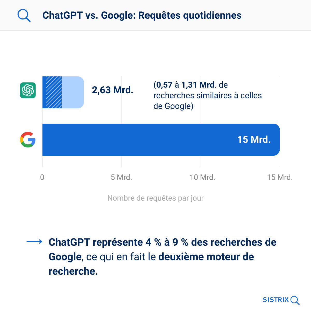 Le constat est sans appel : le SEO traverse une phase de bouleversements historiques. Pour la première fois depuis des années, l’hégémonie de Google semble sous pression. Bien que le volume de recherche quotidien de ChatGPT (entre 0,57 et 1,31 milliard de requêtes) reste modeste face aux 15 milliards de requêtes quotidiennes sur Google, ChatGPT capte d’emblée environ 9 % de parts de marché, devenant ainsi le deuxième moteur de recherche au monde.