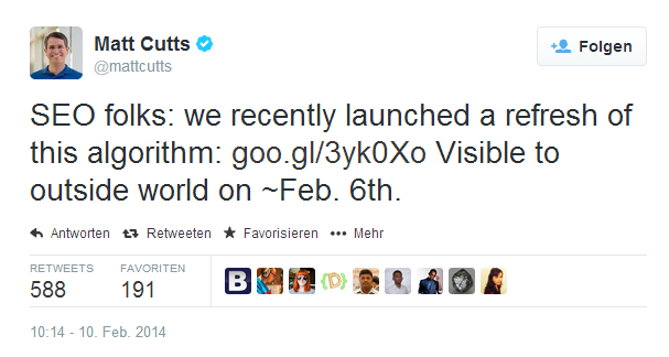 Matt Cutts utilise généralement Twitter pour annoncer qu’une Google Update à fort impact a été lancée. Dans l’exemple ci-dessus, il s’agit de la mise à jour qui avait été baptisée Page Layout Algorithm.