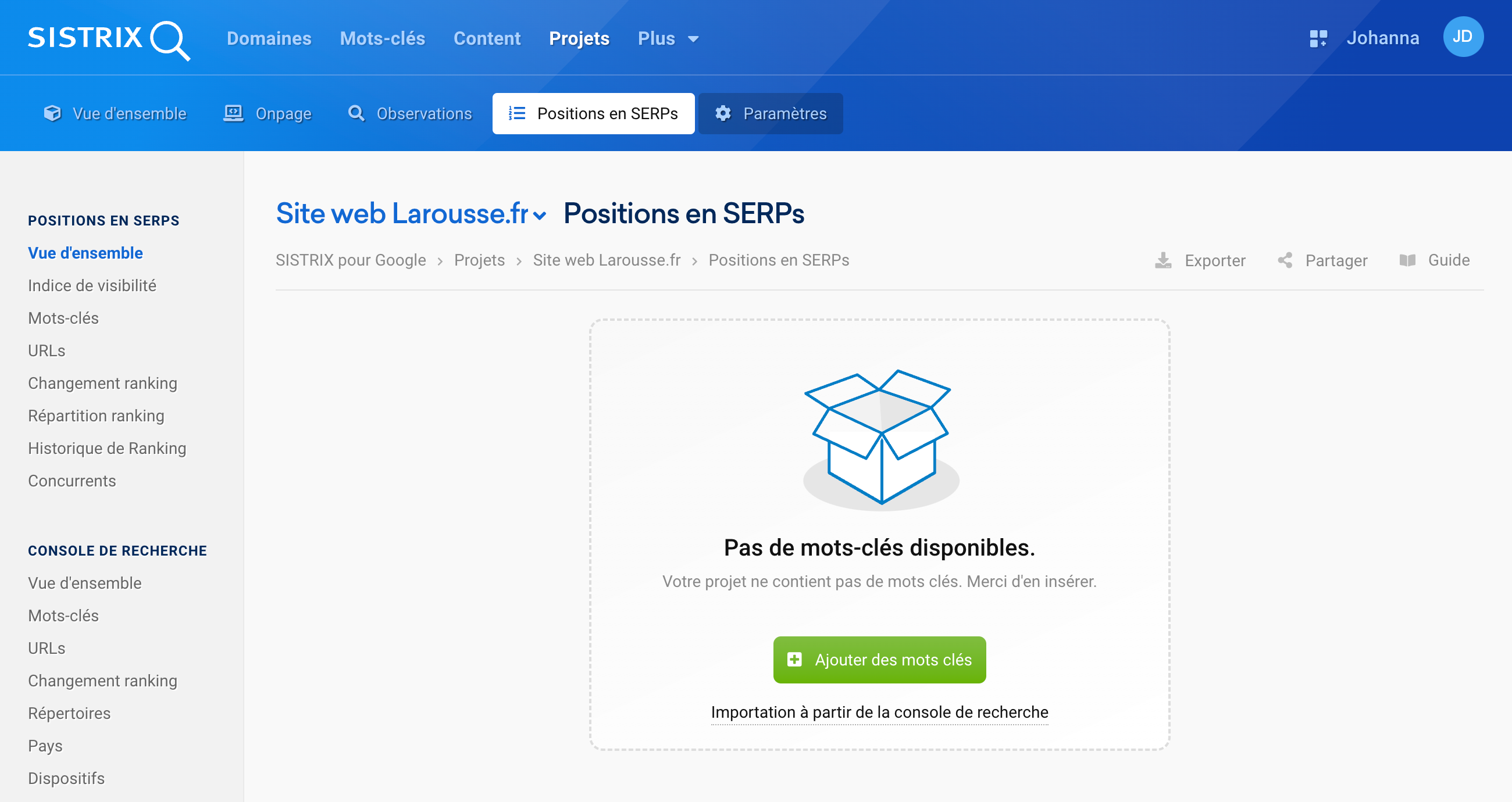 Dès que vous aurez finalisé votre ensemble de mots-clés, vous pourrez passer à la création du projet dans SISTRIX.