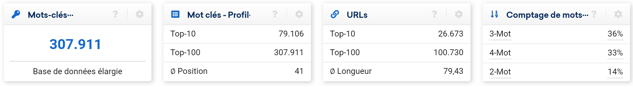 Certaines sections peuvent être ajoutées à un rapport ou à un tableau de bord via la roue dentée en haut à droite3. Vous pouvez également l’utiliser pour exporter le tableau des SERPs situé en dessous de l’aperçu des mots-clés.