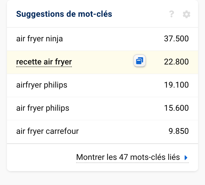 Dans les suggestions de recherche, par exemple, vous pouvez cliquer sur un résultat et vous serez redirigé directement à l’aperçu des mots-clés correspondants. En cliquant sur l’icône à côté2, vous pouvez afficher un aperçu du mot-clé sur la même page.