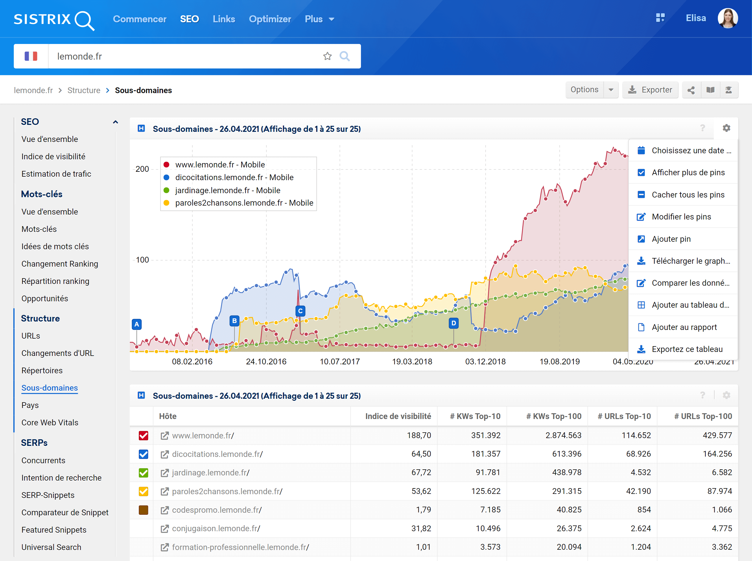 Si vous n’êtes pas intéressé par les six meilleurs sous-domaines indiqués, mais que vous souhaitez plutôt avoir un aperçu des sous-domaines d’un domaine , cliquez sur « Sous-domaines »3 dans la section « Structure » du menu de gauche de l’écran. Vous pourrez tout simplement cliquer sur le sous-domaine de votre choix.